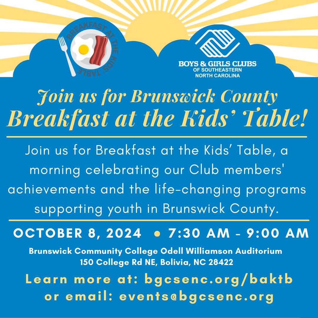 Join us for Breakfast at the Kids’ Table in Pender County! This event is a fun and inspiring way to highlight the successes of our Club members and the life-changing programs we offer. Join us as we shape our kids’ futures!