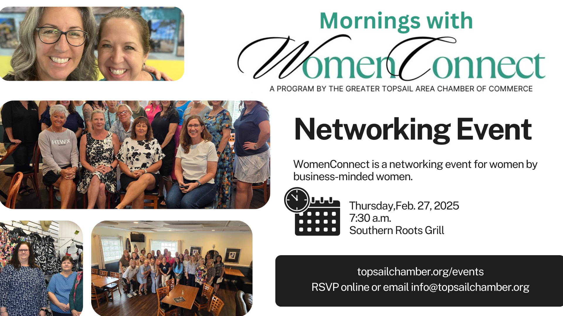 Join Mornings with WomenConnect, a networking opportunity before heading to the office. They meet at Southern Roots Grille at 7:30 a.m. for approximately one hour.Images