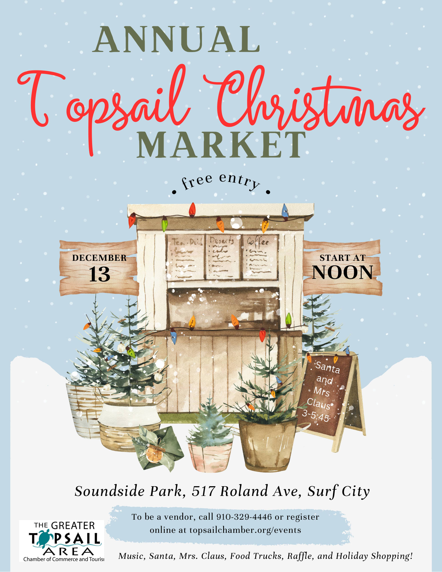 The Annual Christmas Market is held every December in conjunction with the Annual Flotilla. Held in beautiful Soundside Park the Market features unique handmade gifts, food trucks & entertainment. Market opens at 12pm and ends at 6pm or later, food vendors remain open until 7pm. Be sure to stick around for the Annual Flotilla expected to arrive at 6pm; Free and open to the public. If you would like to sign up to be a retail market vendor click the registration button to the right and select one of two options: Member Market Vendor Registration or Non-Member Market Vendor Registration.Images