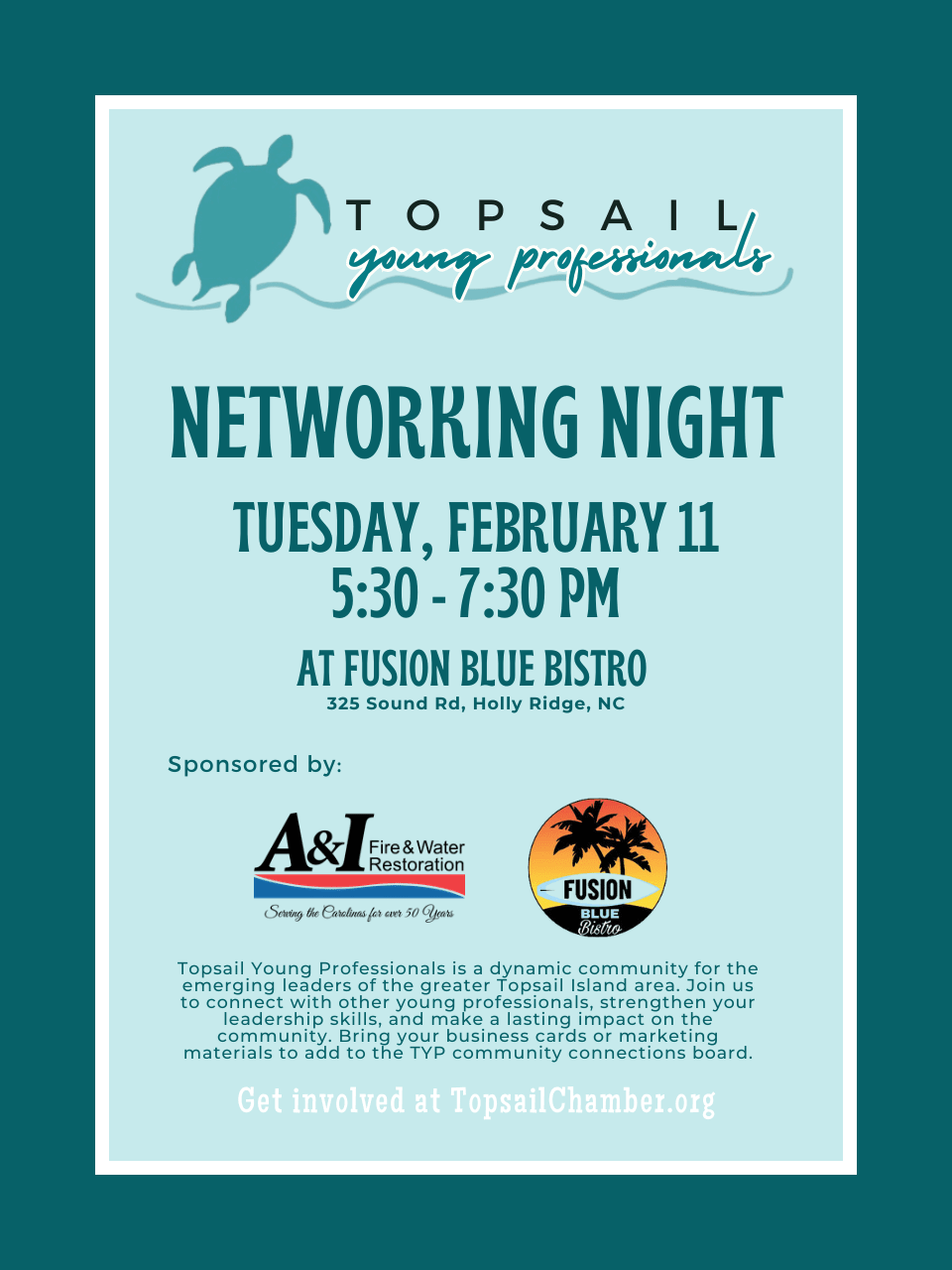 You are invited to join the Topsail Young Professionals for a networking event at Fusion Blue on Feb. 11 from 5:30 - 7:30 p.m.Images
