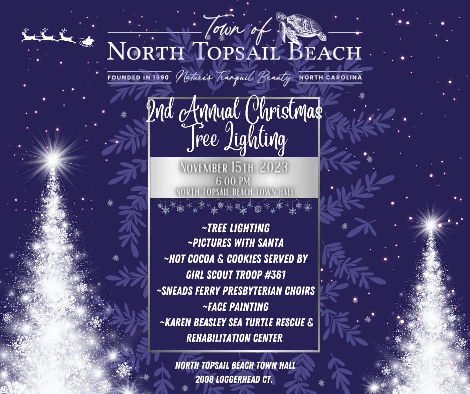 The Town of North Topsail Beach will be holding our 2nd Annual Christmas Tree Lighting at Town Hall on November 15, 2023 at 6:00pm. Join us for the Christmas tree lighting, Pictures with Santa, Hot Cocoa & Cookies served by Girl Scout Troop #361, Sneads Ferry Presbyterian Choirs, Face Painting and Karen Beasley Sea Turtle Rescue & Rehabilitation Center.