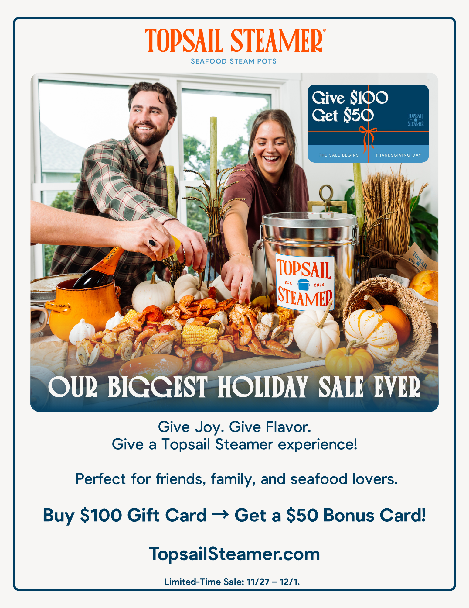 Give joy. Give flavor. Give a Topsail Steamer experience. Buy $100 Gift Card and receive a $50 bonus card. Offer good from Nov. 27 to Dec. 1.