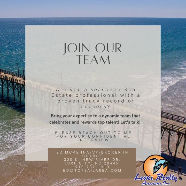 Bring your expertise to a dynamic team that celebrates and rewards top talent! We are hiring seasoned Real Estate professionals. Reach out to Ed McKenna, VP/Broker In Charge, 320 N. New River Dr., Surf City. Call 910-232-1010 or email ed@topsailarea.com.