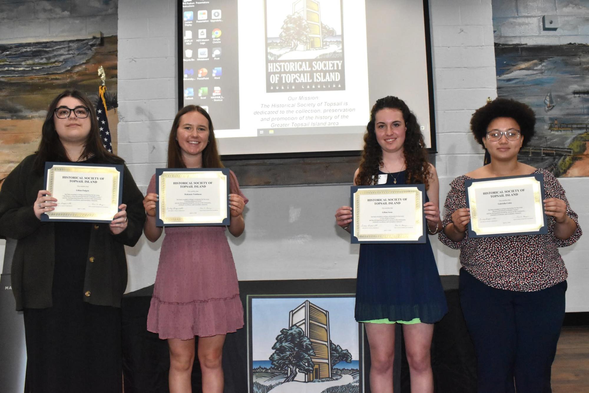 TOPSAIL BEACH NC– For almost thirty years, the Historical Society of Topsail Island (HSTI) has awarded scholarships to area high school graduating seniors. This year, the HSTI awarded four scholarships at the annual scholarship luncheon on April 11th. The scholarships ranged in value from three to six thousand dollars.